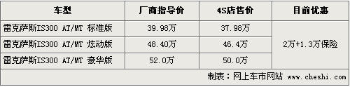 據4S店銷售人員介紹,目前雷克薩斯IS300各款現車數量并不多,標準版和炫動版有銀色、白色、黑色等款可供選擇。在價格優惠方面,現在購車可優惠現金2萬,同時贈送價值1.3萬元的保險。銷售人員還介紹,購買IS300時,根據車身顏色不同其價格還將有一定幅度的變化。
