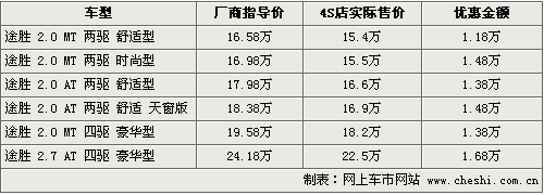 北京現(xiàn)代途勝是一款兼顧越野和城市兩種風(fēng)格的SUV車型,其經(jīng)濟(jì)實用性表現(xiàn)突出。途勝的整車設(shè)計不僅時尚,各個細(xì)節(jié)還體現(xiàn)出設(shè)計者對城市SUV實用性的把握。根據(jù)網(wǎng)上車市價格監(jiān)測系統(tǒng)顯示,目前途勝全系優(yōu)惠幅度均有一定程度變化,具體車型以及價格如下: