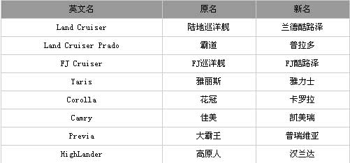 從最早的“霸道”因廣告事件更名“普拉多”(Prado),到“花冠”更名“卡羅拉”、“佳美”更名“凱美瑞”,以及最新的“蘭德酷路澤”和“FJ酷路澤”等。這也許是精明的日本人學(xué)習(xí)中國(guó)歷史并將之付諸實(shí)際的想法,他們希望在中國(guó)汽車市場(chǎng)能夠如秦始皇一般統(tǒng)一天下,并統(tǒng)一度量衡和文字。