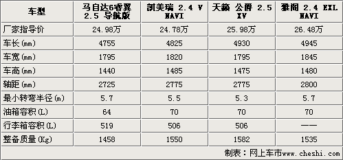 我們選取的四款車型都是位于該車系中的頂配車型,售價(jià)都在25萬元左右,馬自達(dá)6睿翼在這四款車型中屬于售價(jià)比較低的。在車身尺寸方面馬自達(dá)6睿翼是4款車型中最小的,同時(shí)在軸距方面也只有2725mm,這意味馬自達(dá)6睿翼在這四款車型中的內(nèi)部尺寸應(yīng)該是最小的。雅閣的軸距是四款車型最大的,達(dá)到了2800mm,保證了雅閣內(nèi)部空間的寬敞。凱美瑞和天籟•公爵都同時(shí)擁有2775mm的軸距,它們?cè)趦?nèi)部空間上將不會(huì)有太大的差距。四款車型中除了馬自達(dá)6睿翼外其余三款車型均達(dá)到了70升。由于馬自達(dá)6睿翼身材較小,所以在整車質(zhì)量方面它也是4款車型中最輕的。