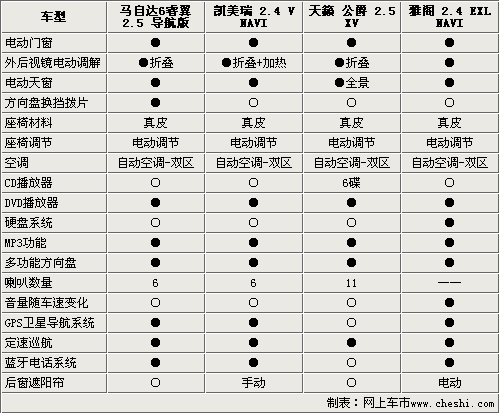 上述四款車型都屬于該車系中的頂配車型,所以在舒適配置方面可謂是應(yīng)有盡有,電動(dòng)天窗、真皮座椅、自動(dòng)雙區(qū)空調(diào)、多功能方向盤等設(shè)備都成為了標(biāo)準(zhǔn)配置。但仔細(xì)看下來,天籟•公爵的全景天窗比較突出,這是同級(jí)別車型中很少可以看見的。在娛樂方面,天籟•公爵的11揚(yáng)聲器系統(tǒng)比較突出,音像水平完全達(dá)到了發(fā)燒的級(jí)別。而雅閣的硬盤系統(tǒng)顯示出了它的科技感。四款車型中,只有天籟•公爵沒有配備GPS衛(wèi)星導(dǎo)航系統(tǒng)外。