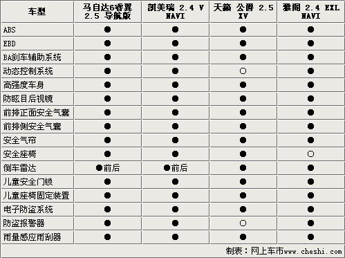 隨著汽車市場(chǎng)的日益成熟,安全能力逐漸也成為了車主最為關(guān)心的問題。可以看出ABS+EBD和6安全氣囊均成為了這四款車型的標(biāo)準(zhǔn)配置。四款車型里天籟•公爵沒有配備車輛行駛動(dòng)態(tài)控制系統(tǒng)是一個(gè)不小的遺憾。在大多數(shù)車型都裝配了氣囊的情況下,馬自達(dá)6睿翼、凱美瑞和天籟•公爵還提供了安全座椅去保護(hù)前排乘員的頭頸部安全,這一點(diǎn)非常值得稱贊。另外這四款車型均裝備了自動(dòng)防眩內(nèi)后視鏡,更加保障了夜間行車的安全。