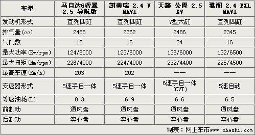 通過以上橫向?qū)Ρ龋梢钥闯鏊目钴嚨呐帕慷荚?.4這個(gè)區(qū)間,但是在發(fā)動(dòng)機(jī)形式方面卻完全不同。馬自達(dá)6睿翼、雅閣和凱美瑞都為直列四缸發(fā)動(dòng)機(jī),天籟•公爵則采用的是被評(píng)為十佳的VQ發(fā)動(dòng)機(jī)(V型六缸)。值得一提的是這四款車型都具備了日系發(fā)動(dòng)機(jī)傳統(tǒng)的特點(diǎn):性能良好、油耗經(jīng)濟(jì)。由于天籟•公爵采用的是V型六缸發(fā)動(dòng)機(jī),所以在動(dòng)力輸出方面相比另外三款車型要明顯突出。在變速箱方面,天籟•公爵配備的是全新6速手自一體CVT變速箱,相對(duì)另外三款車型的變速器來說天籟•公爵則更可以體驗(yàn)到駕駛的樂趣。四款車型的制動(dòng)系統(tǒng)都是前通風(fēng)盤后實(shí)心盤。