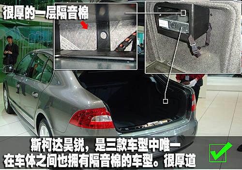 打開行李箱后我們通?梢栽谝恍半[蔽”的地方發(fā)現(xiàn)一臺車的細(xì)節(jié)做工,例如這部分對比中您將看到斯柯達(dá)-昊銳在三款車型中獨有的“車輛內(nèi)側(cè)隔音棉”。