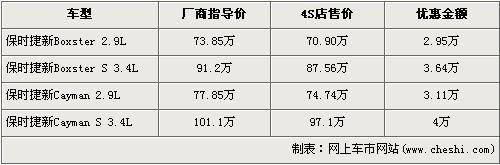 據北京保時捷4S店銷售人員介紹,由于去年的經濟危機席卷全球,以至于全球的經濟形勢都不容樂觀。在去年下半年,保時捷的北美以及德國本土銷量都下降了不少,所以在2009年保時捷力爭以價格優勢搶占中國的超跑市場。為了表示率先占領中國超跑市場的決心,于近期上市的新Boxster和新Cayman兩款經典超跑在上市之際便打出降價牌-全系優惠9.6折。經折扣轉換成現金后,排量同為2.9L的新Boxster和新Cayman售價立即從廠商指導價分別降為了70.90萬元和74.74萬元,而動力更加強勁,排量同為3.4L的新Boxster S和新Cayman S經優惠后售價也分別降為了87.56萬元和97.1萬元。