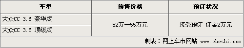 據4S店銷售人員介紹,目前大眾CC已經可以接受消費者預訂,訂金為2萬元。4月份4S店首批車型將到店,預計這款車的售價在52萬-55萬區間,但具體官方價格尚未公布。配置方面,這款車分為豪華版和頂級版,氙氣大燈、電動折疊加熱外后視鏡、定速巡航及電子駐車制動器等均是兩款車型的標準配置。但由于價位以及市場定位的不同,大眾CC轎跑頂級版配備了更加高級的無鑰匙啟動及鎖定系統好和30GB內置硬盤及觸摸屏語音控制。