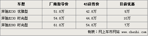 據(jù)4S店銷售人員介紹,目前奔馳E級(jí)現(xiàn)車都較為緊張,多數(shù)是訂單式的銷售方式。因?yàn)镋級(jí)將推出改款車型,所以目前的優(yōu)惠幅度相對(duì)較大,其中E230時(shí)尚型最高優(yōu)惠達(dá)到了10萬元,E230降幅也在9萬元,E280時(shí)尚型優(yōu)惠7萬元后售價(jià)僅為54.8萬元。目前只有個(gè)別4S店內(nèi)有少量銀色和黑色現(xiàn)車供應(yīng),其他店均需要訂車。對(duì)想購(gòu)買E級(jí)車的消費(fèi)者而言,現(xiàn)在出手是最好的時(shí)機(jī)。