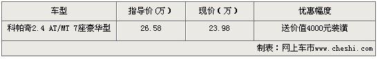 雪佛蘭Captiva科帕奇不僅豐富了雪佛蘭產品陣容,深化了雪佛蘭年輕活力、值得信賴的國際化品牌內涵,更填補了上海通用汽車在中檔SUV細分市場上的空白。近日根據網上車市價格監測系統顯示,上海地區購買雪佛蘭科帕奇2.4 AT/MT 7座豪華型 可以得到2.6萬元的價格優惠。具體車型報價如下表: