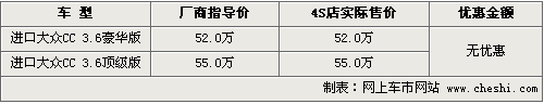 據4S店銷售人員介紹,目前進口大眾CC現車已經到店,共分兩款車型,3.6豪華版售價為52萬元,頂級版售價為55萬元。這兩款車主要差別體現在配置上,頂級版增加了導航和自動泊車系統等高端配置。消費者現在購車的話暫時還沒有優惠幅度出現。現車方面,4S店有黑色、白色、亮銀色、藍色等可供消費者選擇。內飾分別有黑色和黑米兩款可供挑選。