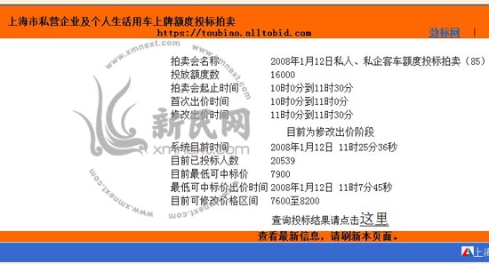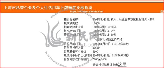 11時(shí)30分,本市2008年第一次私人、私營企業(yè)客車額度競標(biāo)結(jié)束,新民網(wǎng)薛驍翔從現(xiàn)場發(fā)回最新消息稱,本次私車額度平均中標(biāo)價(jià)為23370元,比上月減少32672元,下跌近60%;最低中標(biāo)價(jià)為8100元,比上月足足跌了41900元,投標(biāo)人共計(jì)20539人。