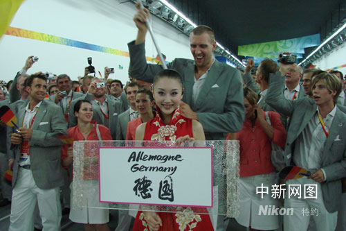 8月8日晚上,唐雯帶領著465名德國隊員走入了鳥巢,她舉著牌子,后面緊跟的是德國隊的旗手、NBA著名球星諾維斯基……