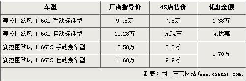 據(jù)經(jīng)銷商處銷售人員介紹,賽拉圖歐風(fēng)全系最高出現(xiàn)1.78萬(wàn)元的優(yōu)惠。賽拉圖歐風(fēng)在售的有4個(gè)車型,入門級(jí)的1.6L手動(dòng)標(biāo)準(zhǔn)版經(jīng)1.38萬(wàn)元的優(yōu)惠后,售價(jià)從廠商指導(dǎo)價(jià)9.18萬(wàn)元降到7.8萬(wàn)元,1.6L豪華版的手動(dòng)版和自動(dòng)版車型都經(jīng)全系最高1.78萬(wàn)元優(yōu)惠后,售價(jià)分別降至8.8萬(wàn)元和9.9萬(wàn)元。經(jīng)銷商處銷售人員還介紹,由于1.6L自動(dòng)標(biāo)準(zhǔn)型沒(méi)有現(xiàn)車所以沒(méi)有在此次優(yōu)惠的列隊(duì)中,其他車型店內(nèi)現(xiàn)車充足。