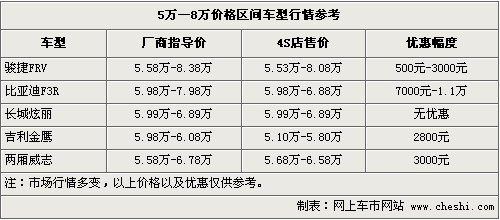 二、價位在5萬—8萬元之間的車型多少顯得有點尷尬,但是像剛上市沒多久的駿捷FRV、長城炫麗還是引來不少的關注度。這個區間車型在價格,配置,安全和舒適度方面表現都比較中庸。但是在駿捷FRV的身上我們能夠看到自主品牌的長足進步。