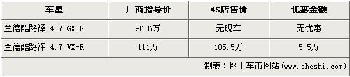 據經銷商銷售人員介紹,豐田-蘭德酷路澤分為4.0L和4.7L兩種排量,由于4.0L車型的尾氣排放是歐III標準,沒有達到北京施行的歐IV標準,所以北京限賣,店內沒有4.0L車型。4.7L車型分為GX-R版和VX-R版,目前低配的4.7L GX-R車型沒有現車,所以不在此次優惠的行列中。高配的VX-R版經5.5萬元優惠后的售價也降到了105.5萬元。