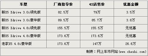 據經銷商處銷售人員介紹,近期購買X5的消費者可以得到最高26.6萬元的優惠。新款的寶馬X5 3.0L車型目前有買車送一半購置稅的活動,購置稅優惠的價值可以直接抵車價,經抵價轉換后,新X5 3.0i領先版和豪華版經3.5及3.8萬元優惠后售價降為了79萬元和85.7萬元,新寶馬X5 4.8i車型目前仍然沒有優惠。銷售人員就介紹,老款的X5 4.8i豪華版有26.6萬元的高額優惠,售價從173.6萬元降到了147萬元。