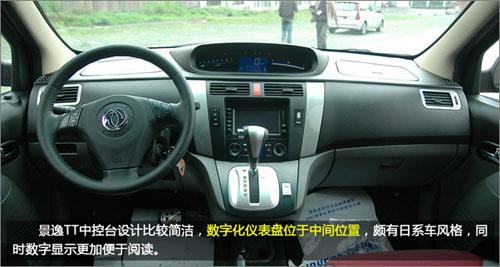 景逸TT的儀表盤位于中控的正中央,紅色的背光特別醒目,發(fā)動機轉(zhuǎn)速、車輛時速、油料情況、音響、空調(diào)控制等信息都能得到充分的顯示。中控臺上采用人機工程學(xué)原理設(shè)計的各種按鍵,簡單易用,處處體現(xiàn)了人性化關(guān)懷的設(shè)計元素。而且,“景逸TT”換擋桿也移至了中控臺上,不僅使用順手便利,更為駕駛員右側(cè)騰出了更大的活動空間。