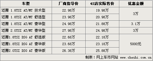 據一汽大眾北京地區4S店銷售人員介紹,目前老款的邁騰車型數量已經不多了,只有少量1.8T和2.0車型。新款DSG版本車型目前在售的有三款,包括了1.8TSI自動檔舒適版和豪華版,以及2.0TSI 自動豪華版。新款售價相比老款有一定幅度的降低,但性價比更高。目前購買新款車型的消費者,也可以有5000元的現金優惠。