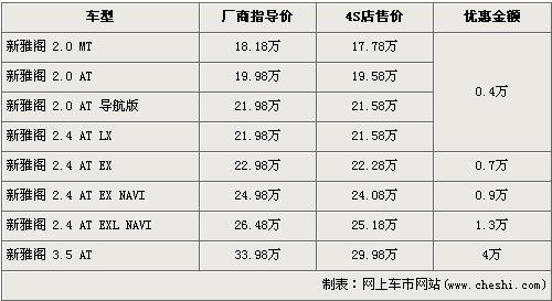 據4S店銷售人員介紹,目前新雅閣全系優惠最高達到了4萬元。新雅閣分為2.0、2.4、3.5三個排量,全系最低配的2.0手動版經4000元優惠后售價降到了17.78萬元,2.4L車型高配的EXL NAVI版經1.3萬元優惠后售價降到了25.18萬元,而3.5排量車型優惠4萬元達到了全系的最高。銷售人員還介紹,除了最低配的車型無現車外,其他車型均有現車。