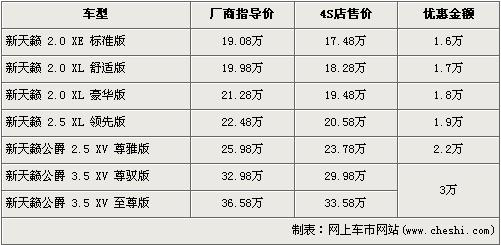 根據4s店銷售人員介紹,近期購買新天籟的消費者可以享受到全系最高3萬元的優惠。新天籟車型分為2.0、2.5以及3.5三個排量,3.5L車型目前讓利3萬元達到了全系的最高,經優惠后3.5 尊馭版和3.5至尊版售價分別降到了29.98萬元和33.58萬元。而其他兩個排量車型則采用的是買車購置稅減半的優惠政策,根據消費者要求的不同,減去的一半購置稅也可以抵車價。全系入門級的2.0標準版經優惠后,售價跌破18萬元,僅為17.48萬元。優惠銷售人員還介紹,新天籟全系均無現車,欲購買車需交訂金1萬元,約等1個月可提車。
