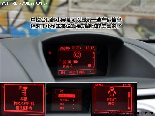 中控臺頂部的顯示屏雖然很小,但是在小型車中還是不多見的,而且功能也比較豐富,包括時間、音頻、車輛信息和一些簡單功能設置。比如可以調節音效,收音機的選臺存臺,CD播放等,基本上以音頻信息為最有用的。此外,還有車輛警示信息,比如車門未關、自動擋擋位沒在P擋等,而且警示信息顯示時還有紅色進度條一直在行進,進度條結束了信息也就不顯示了。