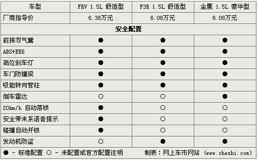 在安全配置方面,三款車型都標配前排雙氣囊、ABS+EBD、高位剎車燈、車門防撞梁這樣的基本配置,同時FRV還帶有20km/h自動落鎖、安全帶未系語音提示、碰撞自動開鎖這三個實用配置,但沒有配置發動機電子防盜。吉利金鷹是唯一配置倒車雷達的車型,能為駕駛員泊車提供幫助。