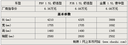 從基本參數來看,比亞迪F3R在車長及軸距在三款車中比較突出,相應的內部空間也將比較寬大些,而駿捷FRV稍次之但車身較高,頭部空間方面會比較好一些,而金鷹明顯要比他們小一號。