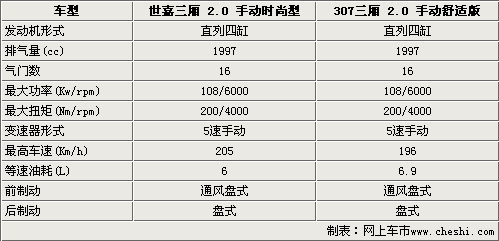 東風雪鐵龍世嘉三廂和標致307動力系統相同,都是2.0升直列4缸發動機并且同時運用了電子節氣門技術,該技術可以能根據駕駛員的需求愿望以及整車各種行駛狀況確定節氣門的最佳開度,保證車輛最佳的動力性和燃油經濟性。兩款車型的動力輸出完全一樣,但是由于各自的整備質量和設計不同,所以在最高時速和油耗上有所區別。兩款車型的變速系統均是5速手動變速箱。制動方式兩款車型均為前通風盤式后實心盤式的剎車。
