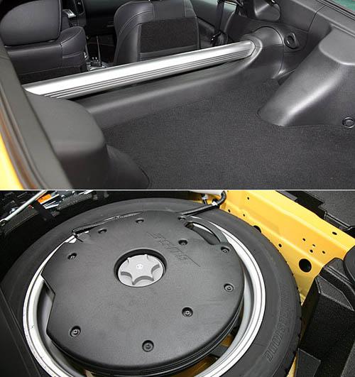 在雙門跑車的弱項(xiàng)的載物能力上,370Z也有不小幅度的提升。掀起掀背尾門,過(guò)去350Z橫貫其中的后懸吊拉桿已看不到了;370Z提供較為完整的行李廂空間,金屬拉桿則前移至行李廂邊緣,在提供車體剛性的同時(shí),降低對(duì)于置物空間的干擾。
