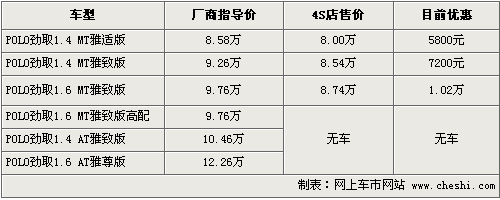 據(jù)銷售人員介紹,目前POLO勁情全系優(yōu)惠幅度從3900元-6000元不等,優(yōu)惠后售價(jià)從8.19萬-10.56萬元。同時(shí),近期推出的POLO運(yùn)動(dòng)款也受到消費(fèi)者喜愛,據(jù)銷售介紹,現(xiàn)車到店即買。運(yùn)動(dòng)款主要有藍(lán)色、黑色以及白色。目前POLO勁情以及運(yùn)動(dòng)版均已沒有現(xiàn)車供應(yīng),需預(yù)定,訂金為1萬,一個(gè)月時(shí)間才能提車。