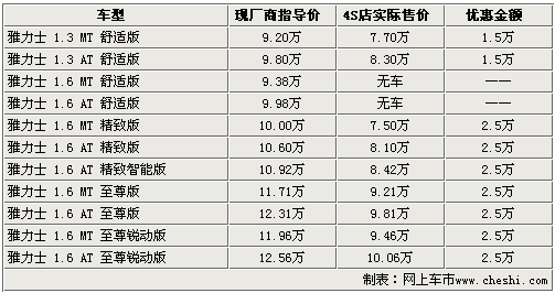 據(jù)4S店銷售人員介紹,目前廣州豐田各4S店內(nèi)雅力士1.3L現(xiàn)車較少,而1.6排量的車型就相對(duì)比較充足,并可提供試乘試駕服務(wù),消費(fèi)者可在展廳內(nèi)近距離接觸展車、親身體驗(yàn)試駕車后直接購(gòu)買現(xiàn)車。銷售人員表示,現(xiàn)在到店購(gòu)買雅力士的消費(fèi)者可享受到最高達(dá)2.5萬的價(jià)格優(yōu)惠,還可得到商家贈(zèng)送的簡(jiǎn)單裝飾等。