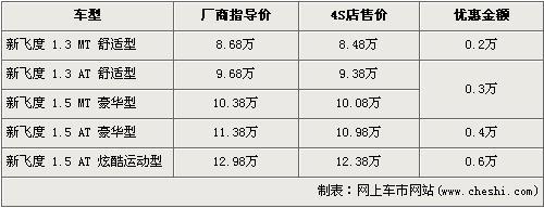 據(jù)廣州本田北京地區(qū)4S店銷售人員介紹,新飛度 1.5L炫酷運(yùn)動(dòng)版的優(yōu)惠金額為6000元。新飛度在售車型分為1.3L及1.5L共5個(gè)車型在售,1.3L手動(dòng)舒適版的優(yōu)惠金額為2000元,現(xiàn)售價(jià)為8.48萬元。1.3L自動(dòng)舒適版的優(yōu)惠金額為3000元,現(xiàn)售價(jià)為9.38萬元。1.5L豪華版的手動(dòng)和自動(dòng)車型經(jīng)4000元優(yōu)惠后,現(xiàn)售價(jià)分別為10.08萬元和10.98萬元,1.5L炫酷運(yùn)動(dòng)版的優(yōu)惠6000元,現(xiàn)售價(jià)為12.38萬元。