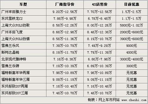 隨著石油價(jià)格逐步上漲,小排量車逐漸受到消費(fèi)者親睞。為了爭(zhēng)得市場(chǎng),各汽車品牌推出的1.6L以內(nèi)AO級(jí)車型數(shù)量和款式越來越多,競(jìng)爭(zhēng)也隨之加劇。以下我們總結(jié)的13款A(yù)O級(jí)車型價(jià)格均在7萬-13萬之間,排量覆蓋了1.2、1.3、1.4、1.5和1.6五個(gè)區(qū)間,可供選擇的空間非常大,而價(jià)格優(yōu)惠從2000元-2.5萬元不等,在消費(fèi)者購(gòu)車時(shí)既可以享受小排量購(gòu)置稅的優(yōu)惠政策,也可以得到4S店的降價(jià)優(yōu)惠,既省車錢,又能少花油錢。具體車型以及價(jià)格優(yōu)惠參考如下: