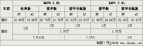 實現國產化后的RAV4分有2.0L與2.4L兩種排量并分別提供手動擋與自動擋車型,同時也因變速箱的差異,在RAV4全系的AT與MT車型間也就有了1萬元的差異。同樣,由于配置的不同,經典版RAV4與豪華版間的差價為1.8萬元,豪華版與頂配豪華導航版車型也存在著1.75萬元的差價。而因搭載了不同排量的發動機,RAV4 2.0L豪華導航版和2.4的豪華版車型的差價為1.15萬元。