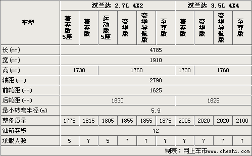 國產漢蘭達的車身尺寸與進口車型相同,由于國產漢蘭達精英型沒有配備車頂行李架,所以要比運動版、豪華版和至尊版矮了30mm。將近2.8米的軸距為漢蘭達提供了舒適的內部空間。國產漢蘭達較進口車型有添加了5座車型,進一步滿足了不同消費者的需求(進口車型均為7座車型)。國產漢蘭達的轉彎半徑僅為5.9米,保證了該車型的道路通過性。