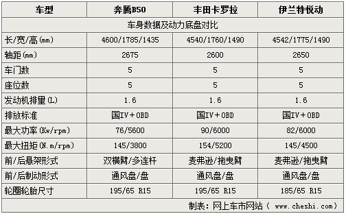 一汽奔騰新款轎車-B50即將在5月16日正式上市,作為向下擴展的重要車型,它被一汽寄予了很大的期待。而在同級市場當中還有很多1.6車型很具有競爭力,比如日系的卡羅拉以及韓系的伊蘭特悅動。作為國產車的奔騰B50到底與這些車型相比有那些優勢呢?這里就將這款即將上市的新車與他們做一個詳細的配置對比,看看三款車型到底區別在那里。