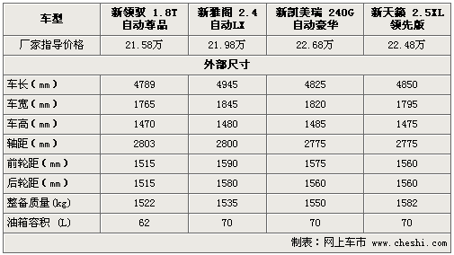 在車身尺寸方面,新雅閣雖然以4945mm的車長(zhǎng)、1845mm的車寬、1590mm的前輪距和1580mm的后輪距位居四款車之首,但新領(lǐng)馭2803mm的超長(zhǎng)軸距是其它三款車不可比擬的。由于整車軸距決定了車內(nèi)空間,所以新領(lǐng)馭的內(nèi)部空間較其它三款車更加寬裕。