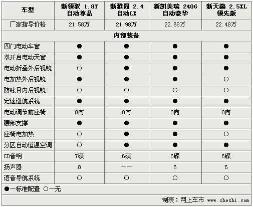 在內部裝備方面,四款中級車更是不遺余力的配備各自高端配置,電動天窗、定速巡航、電動座椅、以及自動空調均稱為四款車的標準配置。但新雅閣、新凱美瑞和新天籟配備的電動折疊外后視鏡,卻沒有出現在新領馭同級車上。此外,新領馭配備的7碟CD和8揚聲器音響系統,似乎較其它三款日系車更加悅耳。