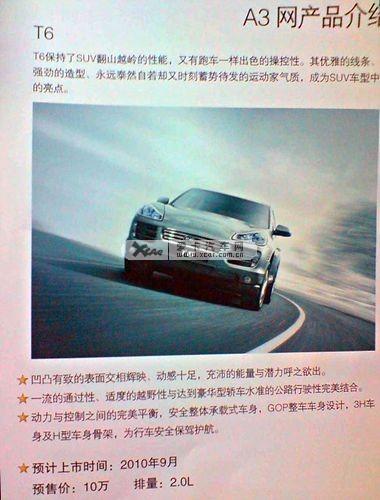在比亞迪的內(nèi)部宣傳資料上寫(xiě)道:“T6保持了SUV翻山越嶺的性能,又有跑車一樣出色的操控性,其優(yōu)雅的線條、強(qiáng)勁的造型、永遠(yuǎn)泰然自若卻又是可蓄勢(shì)待發(fā)的運(yùn)動(dòng)家氣質(zhì),成為SUV車型中的亮點(diǎn)。凸凹有致的表面交相輝映、動(dòng)感十足、充沛的能量與潛力呼之欲出。一流的通過(guò)性、適度的越野性與達(dá)到豪華型轎車水準(zhǔn)的公路行駛性完美結(jié)合。動(dòng)力與控制之間的完美平衡、安全整體承載式車身、GOP整車車身設(shè)計(jì),3H車身及H型車身骨架,為行車安全保駕護(hù)航。”不禁讓人噴飯。