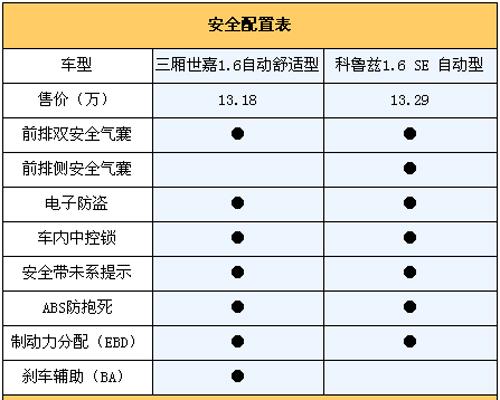 從上面表中我們看出,科魯茲在被動安全配備上更出色,除了正面雙氣囊外還配備了側面安全氣囊,當車輛發生側面碰撞時對駕乘者的保護要更到位。相比之下三廂世嘉只在更高的豪華型中配備了側氣囊,不過三廂世嘉的主動安全方面卻比較完備,ABS+EBD+BA的組合完全可以應付日常緊急情況,而科魯茲相對來說就有些單薄,甚至在當前經濟型轎車都要配備剎車輔助系統的情形下,這項配備的缺失不能不說是一種遺憾!