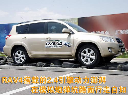 RAV4城市休閑SUV 2.4排量車型,其最大功率和最大扭矩分別為125Km何224Nm,與之匹配的5速手動和4速自動變速器。澎湃的動力性能,讓RAV4城市休閑SUV在模擬炮彈坑路面行駛時行走自如。