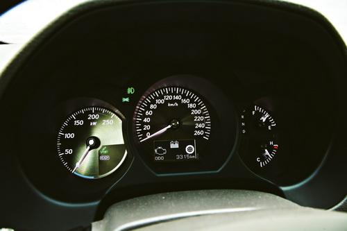 由于使用了電動機(jī)系統(tǒng),GS450h的儀表盤并沒有設(shè)置發(fā)動機(jī)轉(zhuǎn)速表,取而代之的一個功率表,隨時顯示電動機(jī)的瞬時輸出功率;至于中間的車速表和右邊的綜合信息表在所有車型上則都是一樣的。GS系列車型儀表盤另一個特點(diǎn)就是具有ECD電子色控裝置,能夠根據(jù)照射在儀表盤上的光線強(qiáng)度自動調(diào)節(jié)自身亮度,保證駕駛員能夠清晰地讀取數(shù)據(jù)——安全實(shí)用的配置。