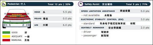在行人安全測試中,Q5成績差強人意。引擎蓋對行人的骨盆部位防御明顯不足。僅保險杠部分相對傷害較小。在安全輔助設備得分中,Q5標配了ESC車身電子穩(wěn)定系統(tǒng),同樣也標配了駕駛席和副駕駛的安全帶提醒。為Q5獲得了71%的得分率。