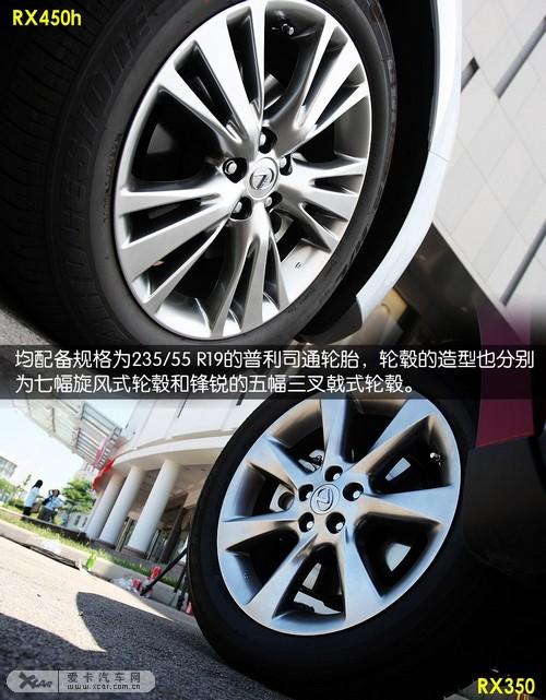 此外,新一代雷克薩斯RX350和RX450h均配備了規(guī)格為235/55 R19的普利司通輪胎,輪轂的造型也分別為七幅旋風(fēng)式輪轂和鋒銳的五幅三叉戟式輪轂,配合鑲嵌銀色鍍鉻飾條的內(nèi)凹式側(cè)裙,散發(fā)著亞光銀光澤的輪圈優(yōu)雅中帶著動感。