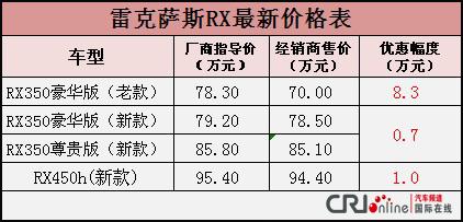 新款RX350分別為豪華版和尊貴版兩款車型,近期購買RX350新款的消費者可以得到7000元的優惠。銷售人員還介紹,剛剛上市的RX450h車型貨源相對比較緊張,所以只有1萬元的優惠,而且目前還有老款RX350的庫存車,優惠幅度較大,達到了8.3萬元,售價達到70萬元。詳細優惠信息如下: