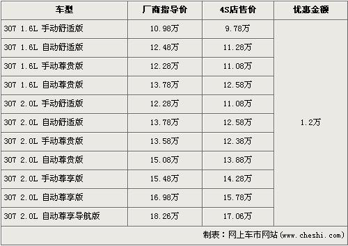 2008年2月20日,帶著家族新面孔“大嘴”形象的東風標致307兩廂閃亮上市,售價區(qū)間為10.98-16.98萬元。近日根據(jù)網(wǎng)上車市價格監(jiān)測系統(tǒng)顯示,現(xiàn)在標致307三廂全系優(yōu)惠金額為1.2萬元,最低售價降到了9.78萬元。據(jù)東風標致4S店銷售人員透露,目前307在現(xiàn)車方面,1.6L車型現(xiàn)車充足,2.0L車型則現(xiàn)車緊張,挑選空間不大。