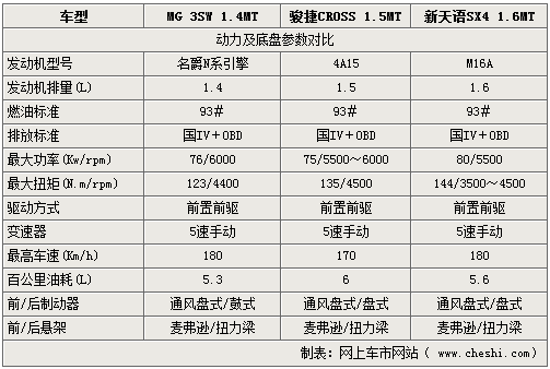 在動力方面,三款車型的排量分別為1.6L,1.5L以及1.4L,在排量不同的基礎(chǔ)上,天語以及名爵MG3在功率輸出方面表現(xiàn)更佳,而駿捷CROSS則在扭矩的輸出方面表現(xiàn)的較為突出。最高車速方面三車相差僅10公里/每小時(shí),底盤的懸架設(shè)計(jì)也基本一致,但是駿捷CROSS的前后盤式制動顯然要優(yōu)于MG3的前盤后鼓的制動設(shè)計(jì),而排量更高的天語則凸顯了日系車的油耗優(yōu)勢。