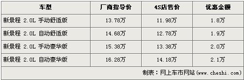 根據經銷商處銷售人員介紹,“大嘴”新景程2.0L手動舒適版現金優惠1.8萬元,經優惠后售價下降到了11.98萬元,已不足12萬。最高配的2.0L自動豪華版車型經全系的最高2.1萬元優惠后,售價降到了14.18萬元。銷售人員還表示,目前店內現車充足,顏色也全,消費者自由挑選的空間變得更加便利,更加自由。