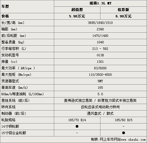 雨燕1.3L超值型的售價為5.98萬元,比炫彩版要便宜一萬元,在車身尺寸和動力性能方面,這款新車都沒有任何變化。但雨燕1.3L超值型只配備了14寸鋼輪轂和14寸輪胎,而炫彩板則配備的是15寸鋁合金輪轂是15寸輪胎。總的來說,雨燕超值型整車的性能基本上并沒有變化。