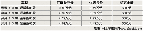 據(jù)銷售人員介紹,奔奔08款目前現(xiàn)車比較齊全,而且優(yōu)惠幅度比前一段時間也有了提高。原來購買奔奔08款只能贈送購置稅,隨著銷售壓力及市場競爭的不斷提高,目前奔奔08款最高可以優(yōu)惠五千元。
