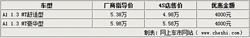 據(jù)銷售人員介紹,奇瑞A1目前可以優(yōu)惠4000元,但豪華型現(xiàn)車不足,部分顏色需要預訂。而且個別4S店的并沒有豪華型現(xiàn)車,也需要預訂,訂金為2000元。